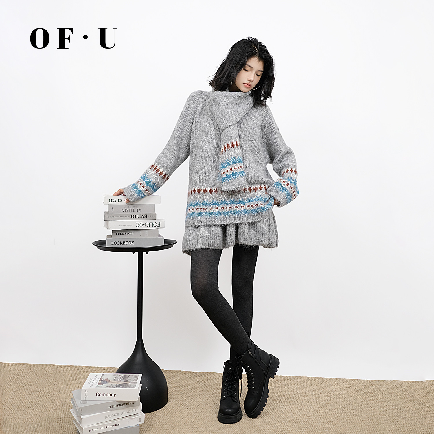OF U慵懒风费尔岛围巾针织衫短裙三件套女秋冬宽松毛衣半身裙套装