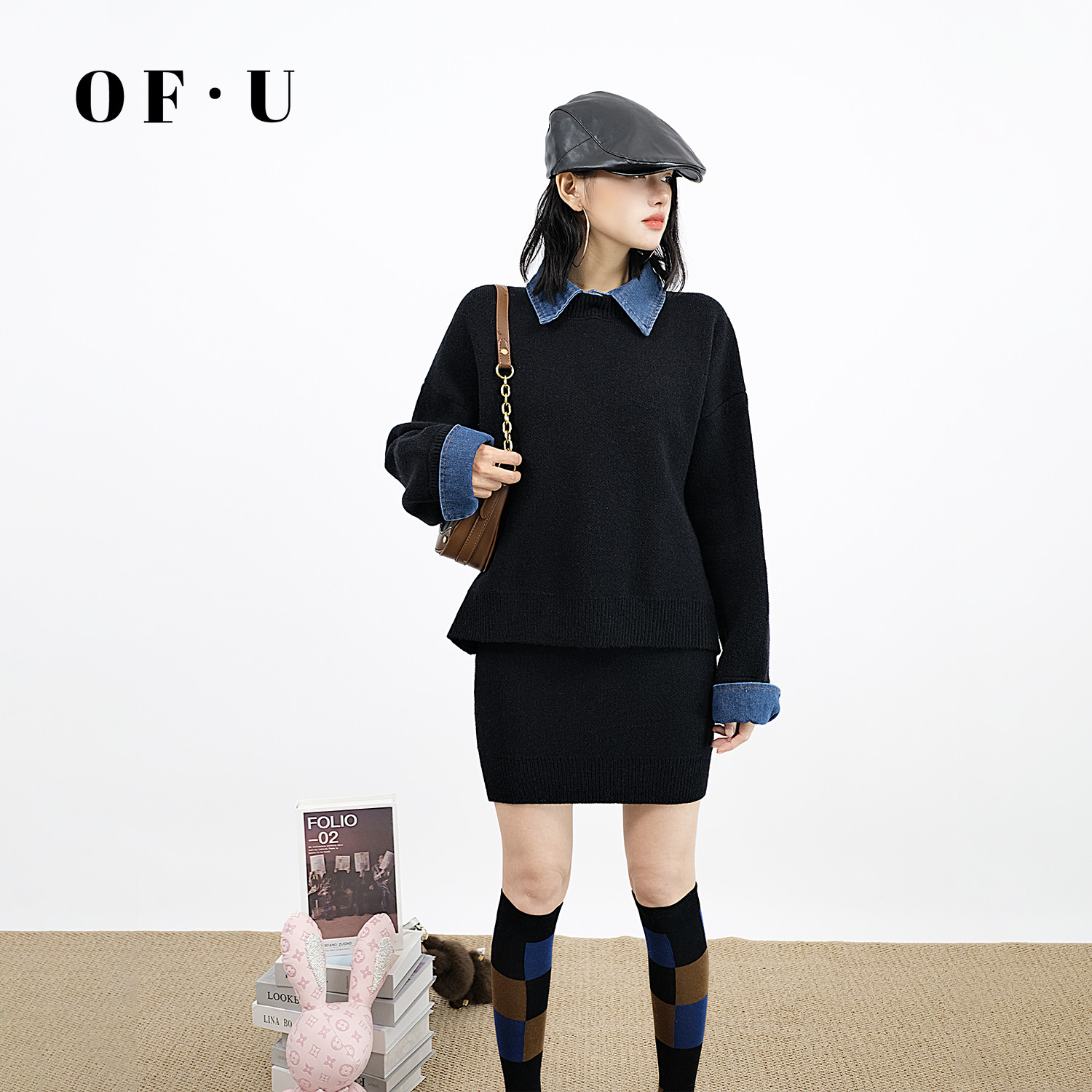 OF U复古假两件牛仔领针织衫短裙两件套女秋冬慵懒毛衣半身裙套装