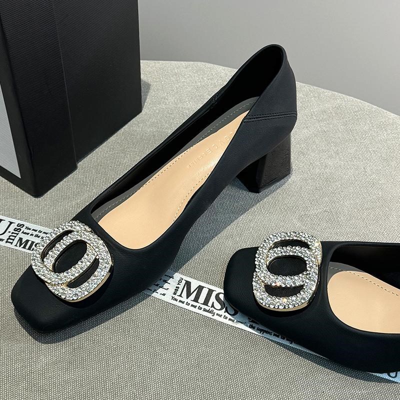 绝美水钻法式方头黑色工作单鞋女2025春秋新款舒适软皮高跟鞋粗跟