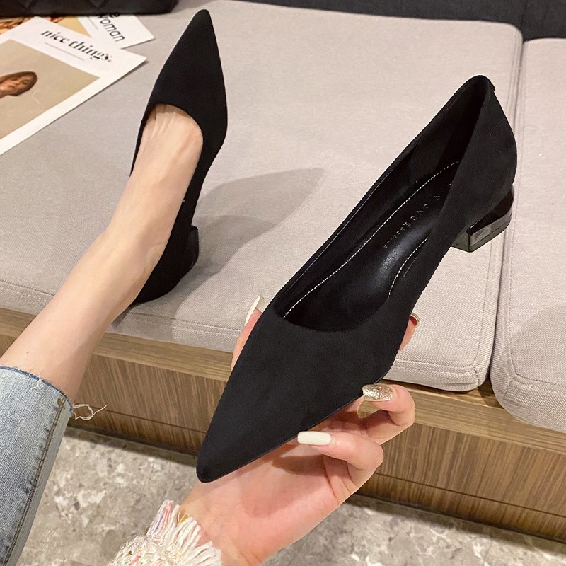 2023新款绒面网红法式尖头浅口小高跟鞋细跟百搭网红黑色工作单鞋