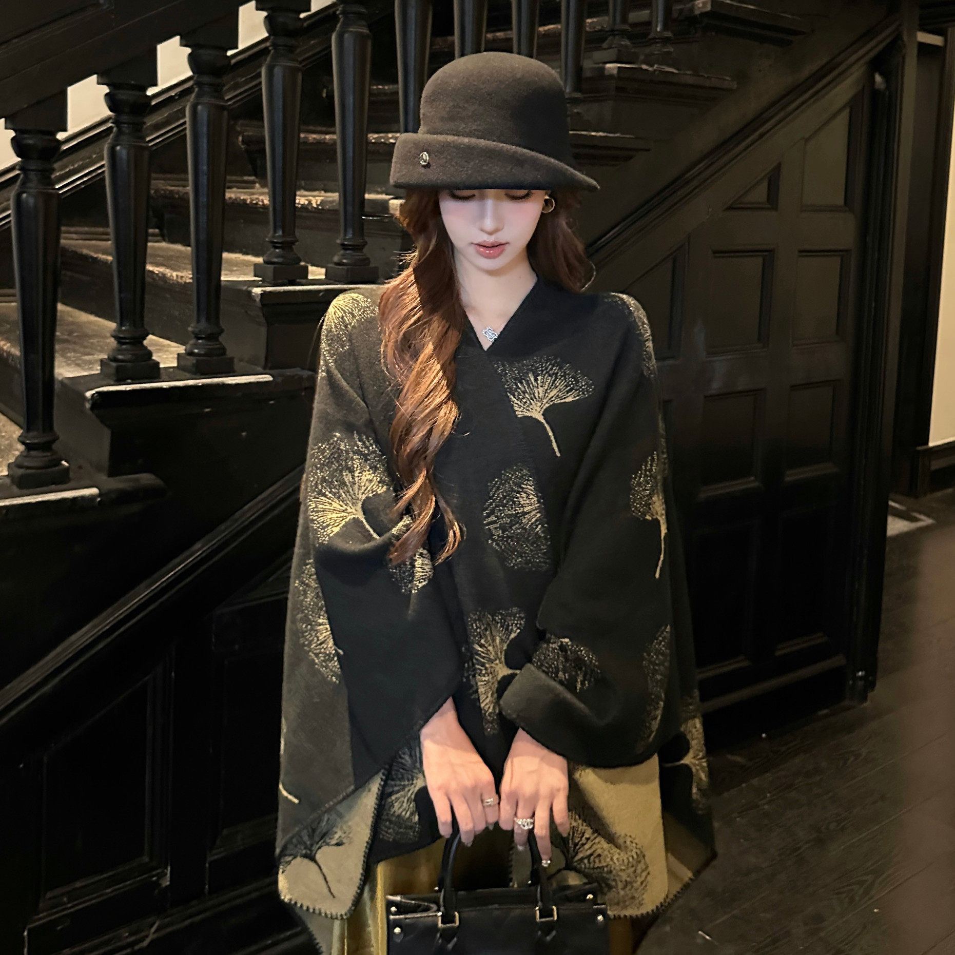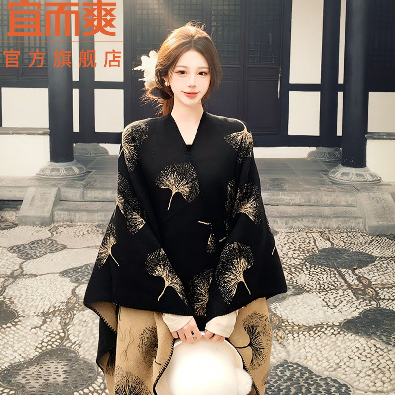 宜而爽2025新款银杏叶外搭披肩女秋冬民族风复古斗篷旅游百搭披风
