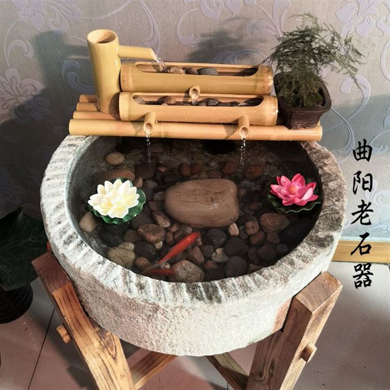 老石槽石磨流水石盆养鱼石头鱼缸养花石盆竹子流水器室内水晶观池