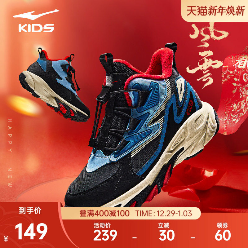 川尘3鸿星尔克童鞋冬季鞋子儿童加绒高帮棉鞋男大童鞋防水休闲鞋