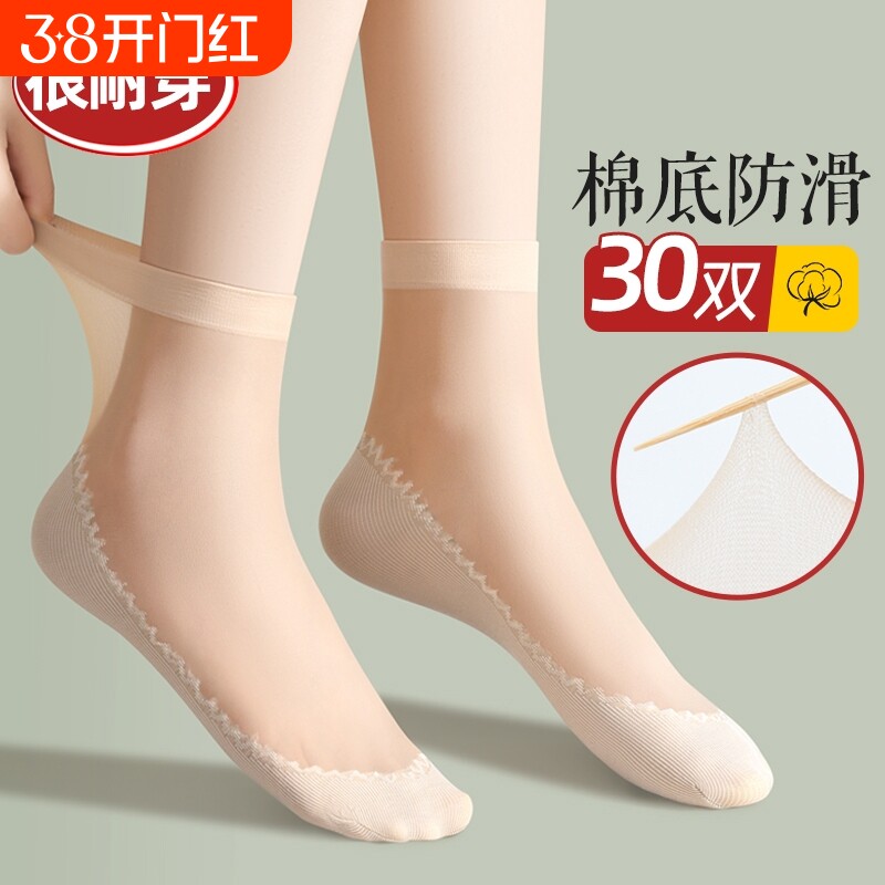春秋防滑纯棉底玻璃丝袜水晶短袜冰丝袜子女中筒耐磨夏天薄款透明