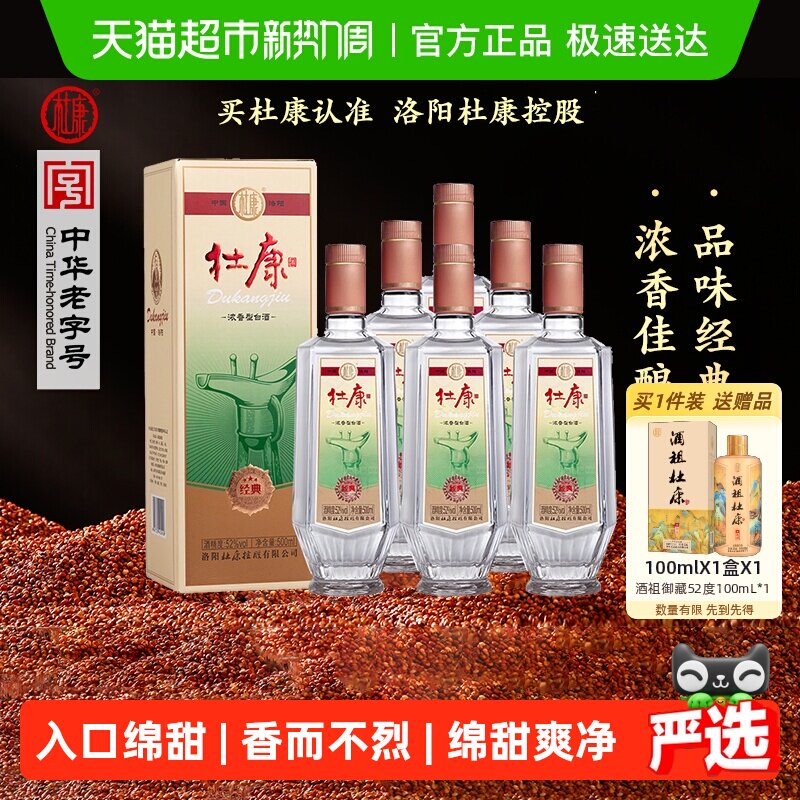 杜康经典酒52度纯粮口粮粮食酒浓香型高度白酒500ml*6瓶整箱装