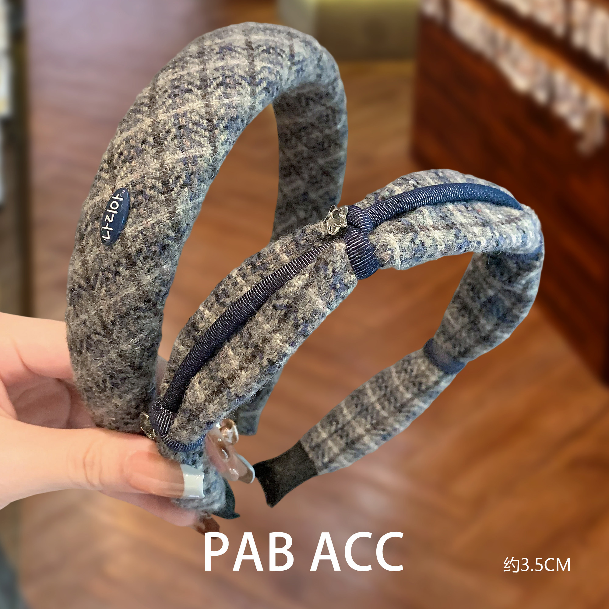韩国简约高级感格纹蓝灰高颅顶星星水钻布艺发箍压发捆海绵头箍女