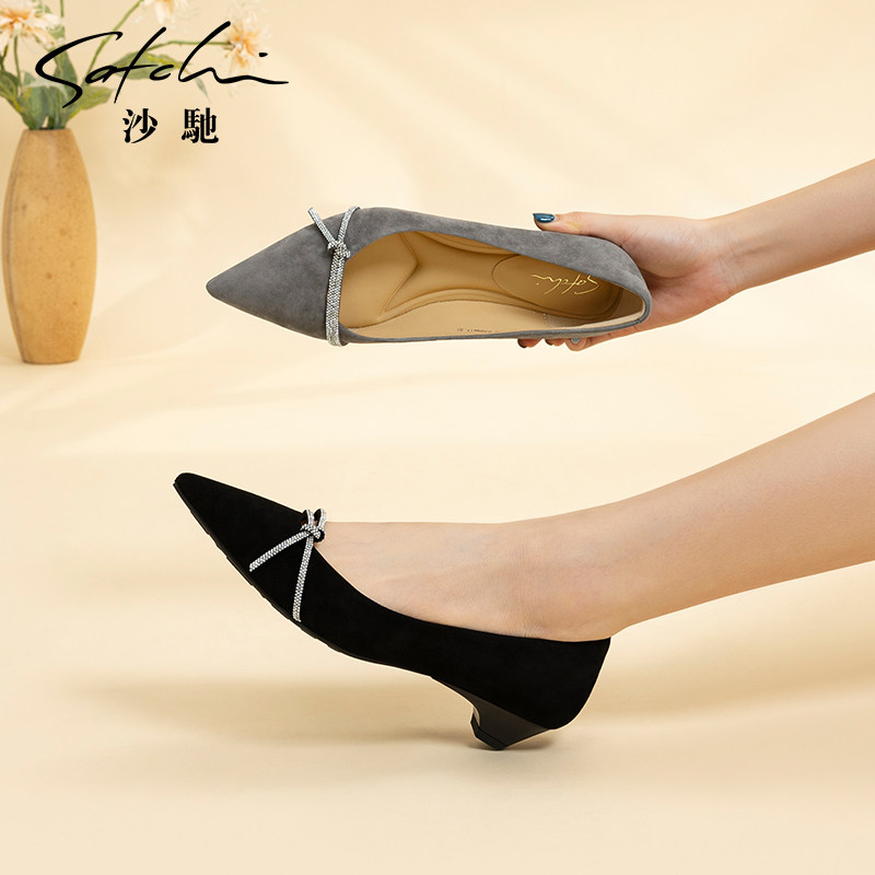 沙驰女鞋细跟低跟职业单鞋2025秋季新款时尚闪钻尖头通勤鞋工作鞋