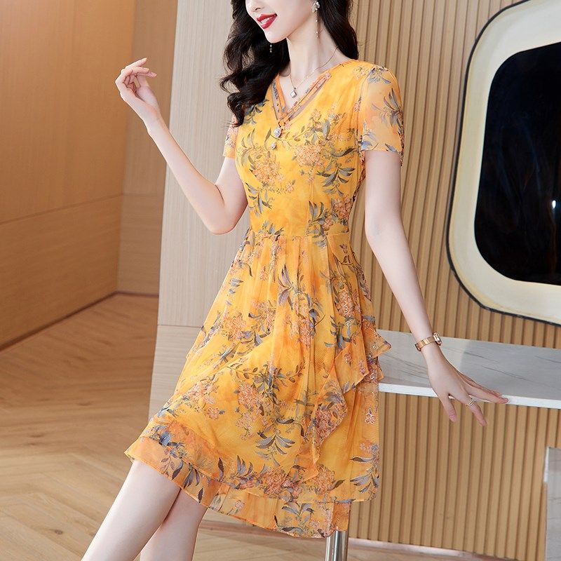 - 长款碎花雪纺连衣裙