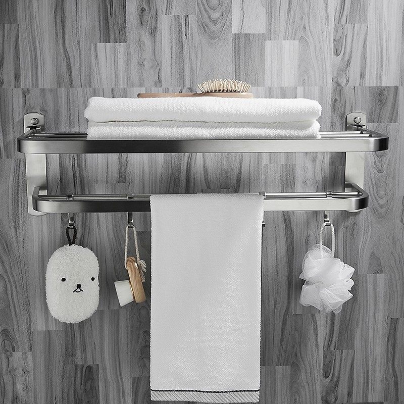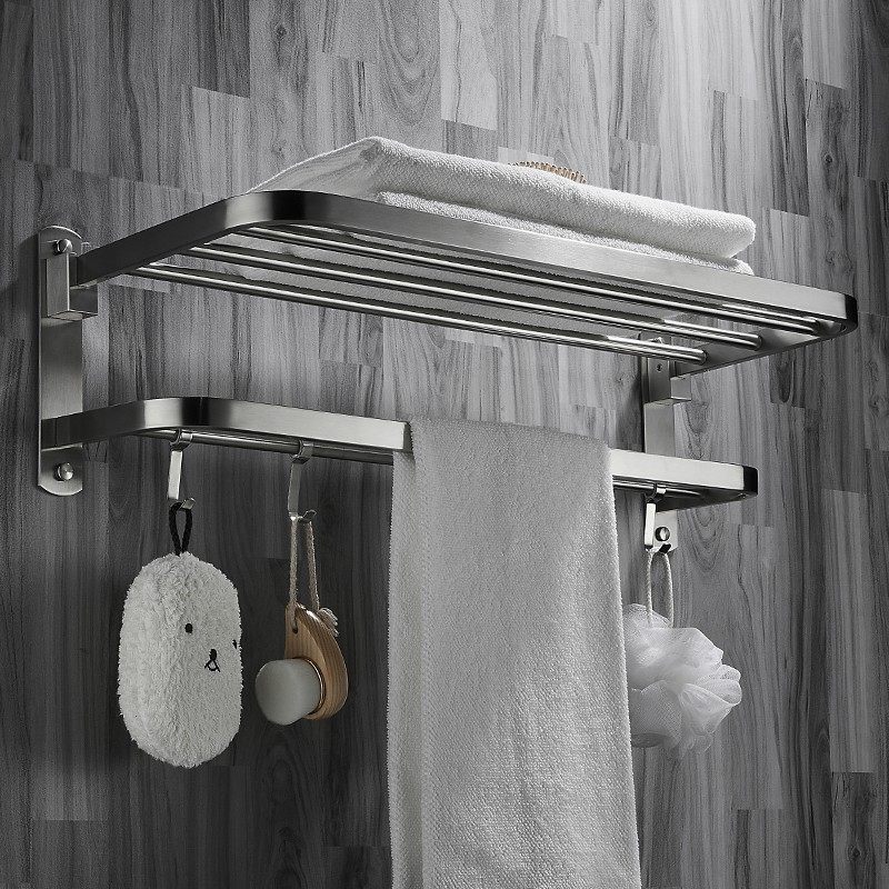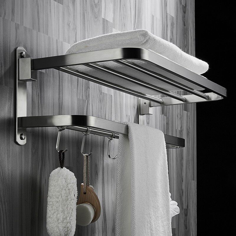 304不锈钢折叠带钩浴巾架 免打孔卫生间拉丝双层毛巾杆浴室置物架