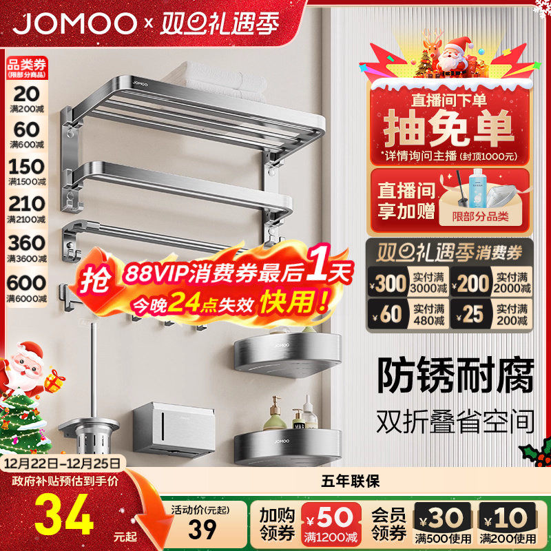 九牧官方卫浴浴巾架卫生间置物架免打孔太空铝浴室挂件套装毛巾杆