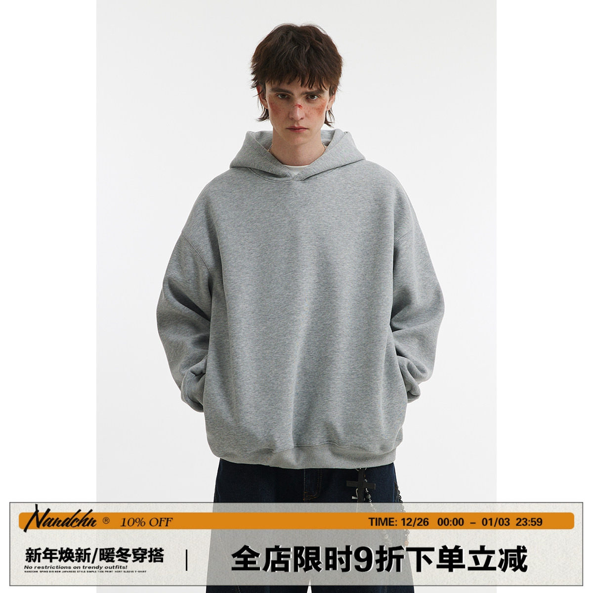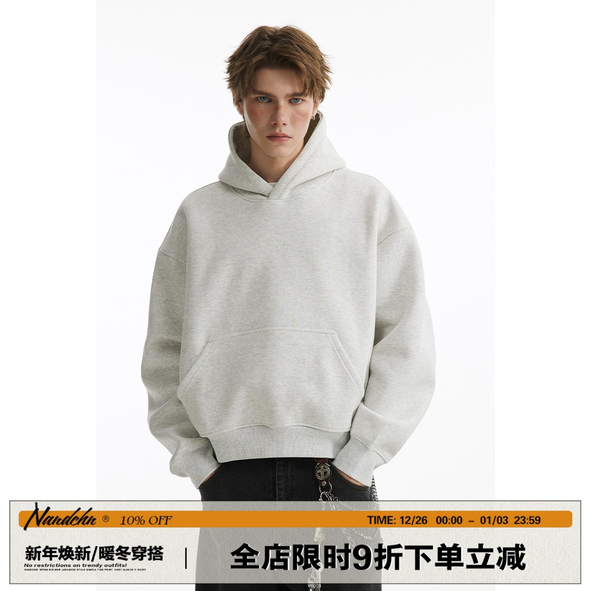 NEVERNEED灰色重磅加绒连帽套头卫衣男女秋冬季短款boxy外套帽衫
