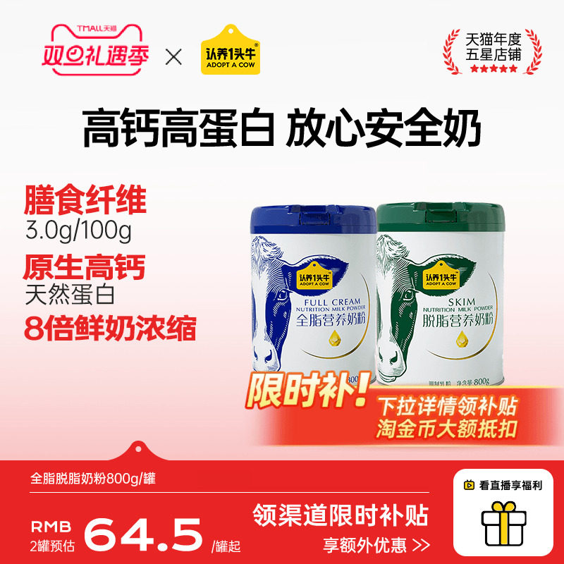 认养一头牛旗舰店A2 β-酪蛋白吨吨奶粉成人女士脱脂奶粉学生儿童