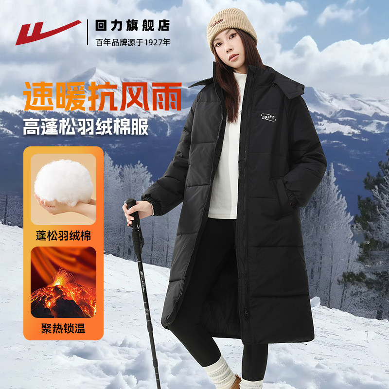 回力中长款羽绒棉服女2025冬季新款韩版宽松棉袄加厚连帽棉衣外套