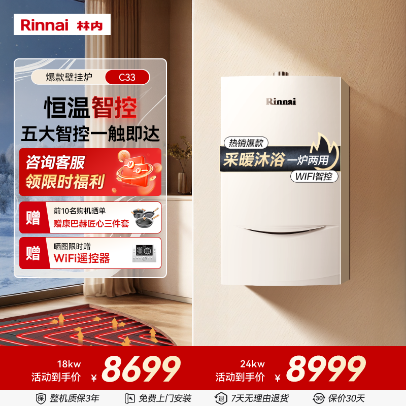 【自营】林内壁挂炉C30家用锅炉地暖气热水器C33采暖炉零冷水C66L