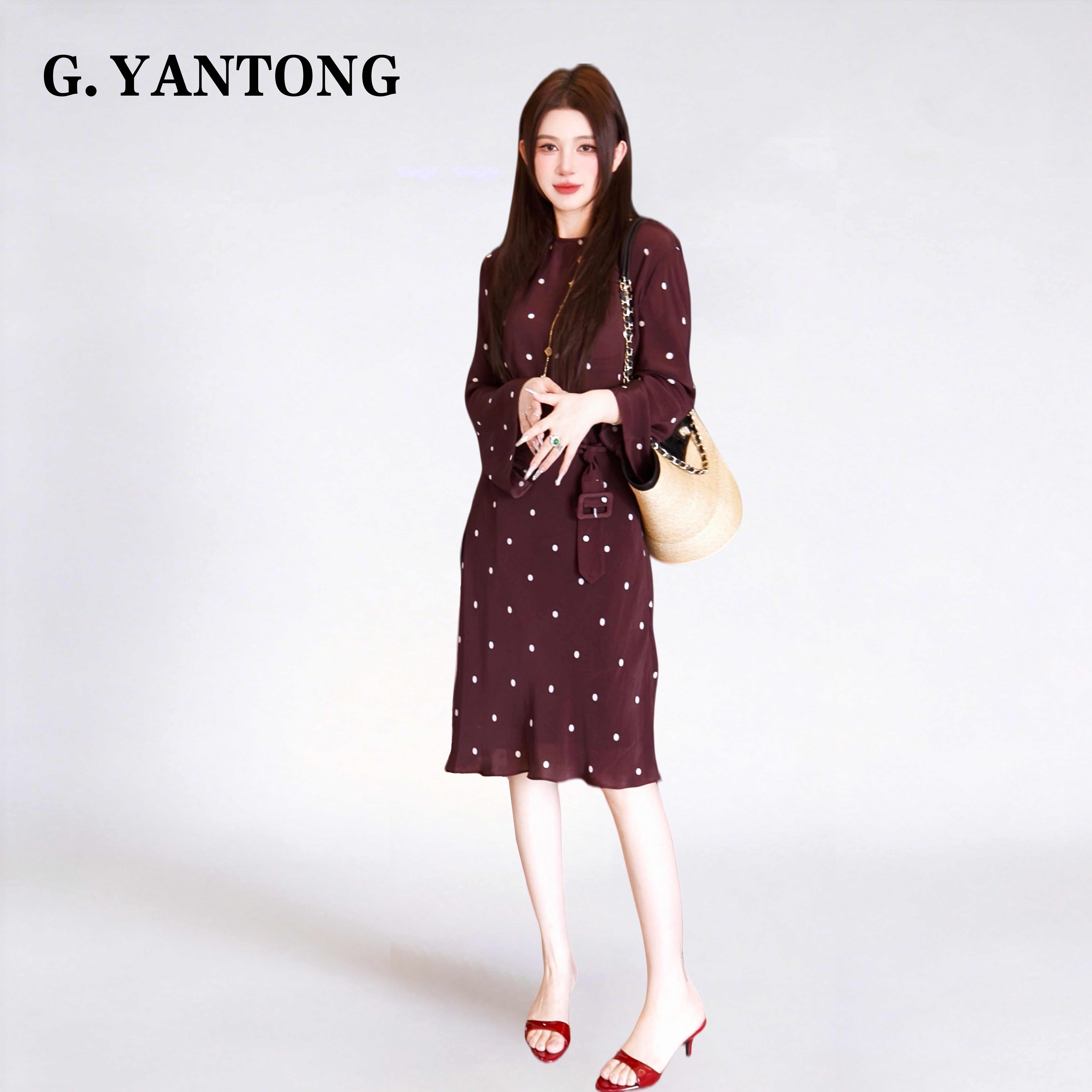 郭彦彤法式波点时尚显瘦中长款连衣裙长袖修身长袖收腰女QZ1091