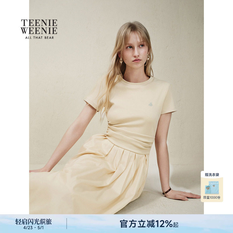 TeenieWeenie小熊女装26夏休闲时尚日常通勤拼接短袖中长款连衣裙