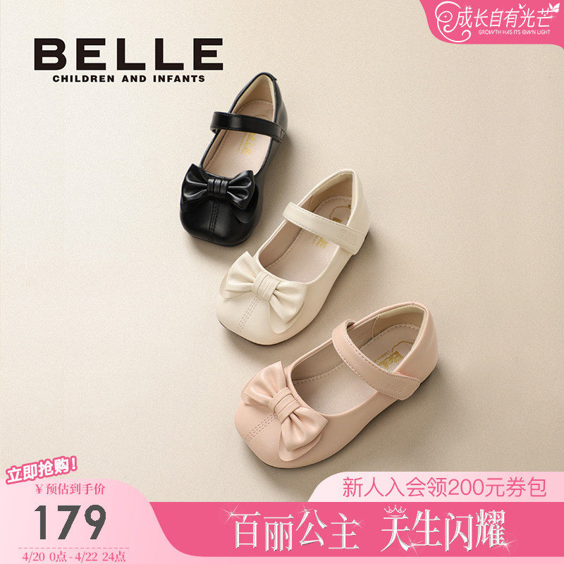 百丽童鞋26春季新款女童闪钻宝石蝴蝶结公主鞋软底舒适皮鞋水钻鞋