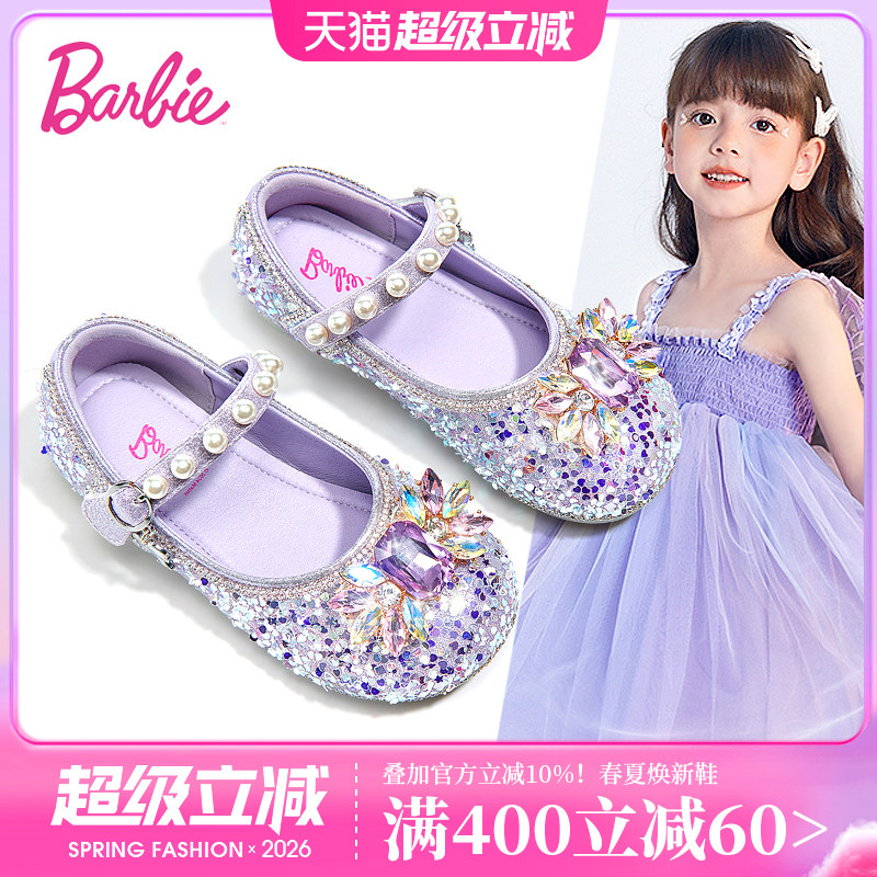 芭比童鞋女童皮鞋2026新款春季软底艾莎公主鞋小女孩水晶鞋女儿童
