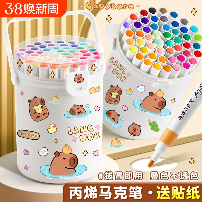 卡皮巴拉丙烯马克笔小学生专用儿童环保可水洗彩笔幼儿园涂鸦水彩笔画笔笔不透色可叠色diy手绘手工绘画桶装