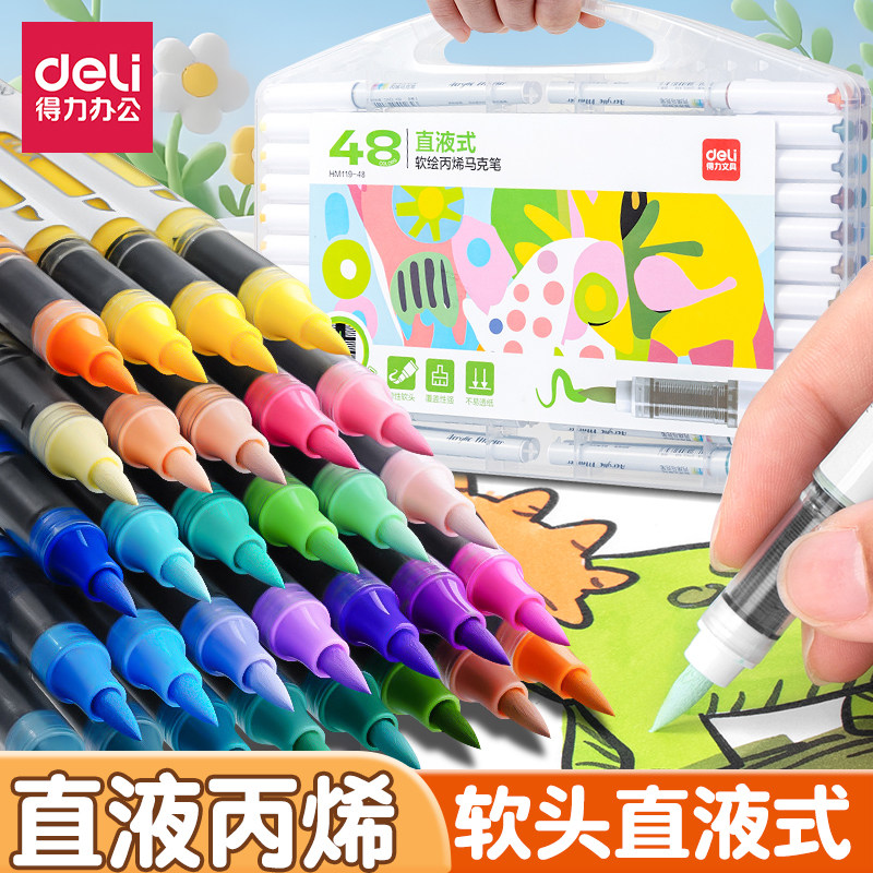得力直液式丙烯马克笔软头小学生美术专用不透色可叠色儿童可水洗彩笔水彩笔幼儿园涂色马克笔颜料笔画笔60色