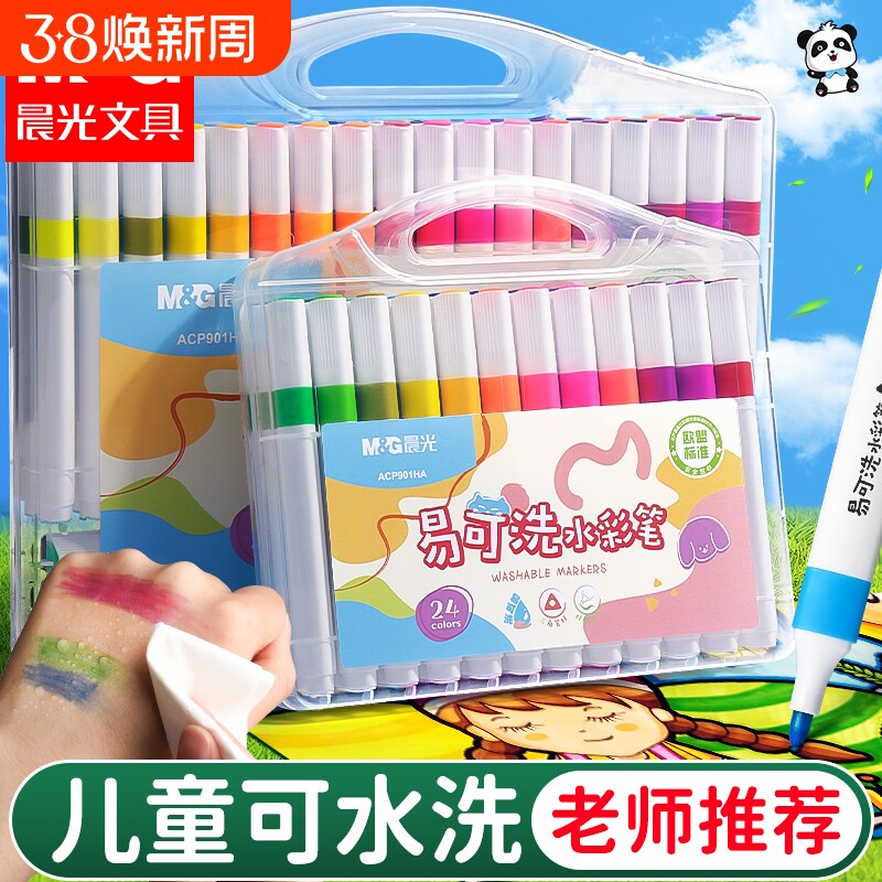 晨光易可洗水彩笔小学生专用儿童可水洗彩笔水溶性幼儿园专用彩色笔24色画画笔易可洗12色软头绘画48色