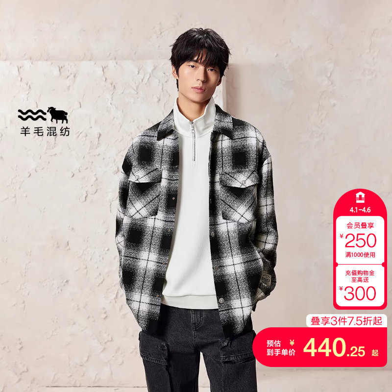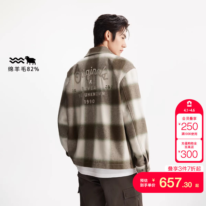 杰克琼斯男装春秋季新款毛呢大衣休闲宽松含羊毛字母格纹刺绣外套