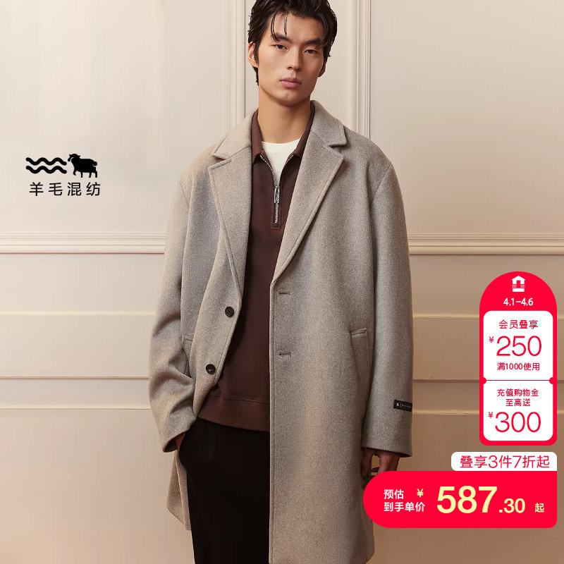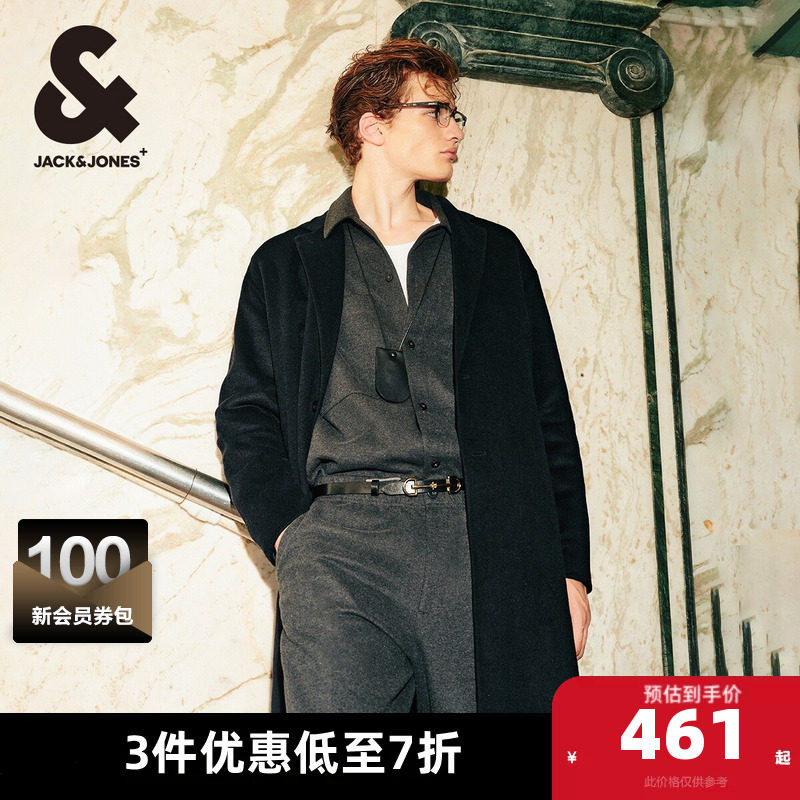 杰克琼斯奥特莱斯男装士春秋新款毛呢大衣长袖宽松潮流平驳领上衣