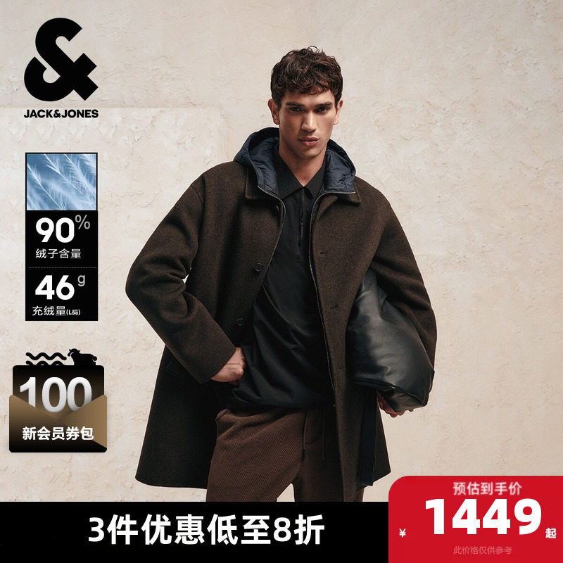 杰克琼斯奥特莱斯男装士春秋季新款毛呢大衣长袖舒适插袋连帽上衣