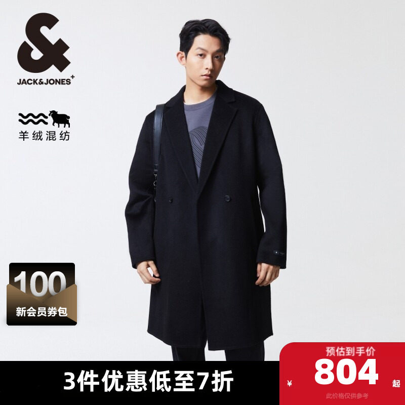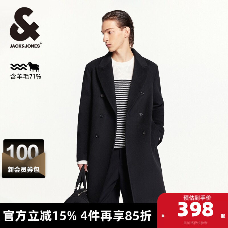 jq区绫致杰克琼斯男秋毛呢大衣黑色长双排扣口袋平驳领潮上衣外套