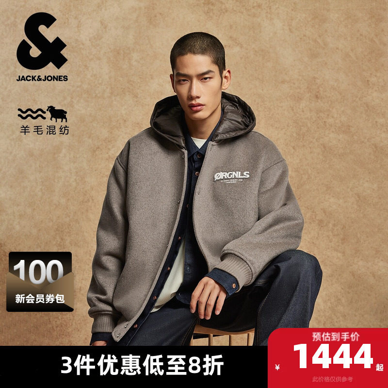 杰克琼斯男装春秋毛呢大衣夹棉可拆卸连帽棒球领含羊毛通勤风外套