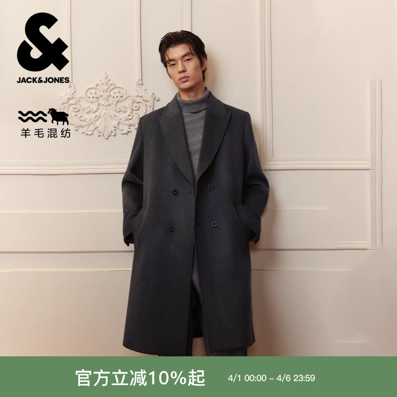 杰克琼斯2024年春秋季毛呢大衣男含羊毛休闲商务中长夹克上衣男装