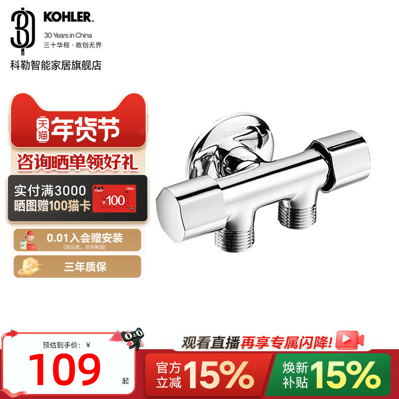 科勒三通四通接头一进二出角阀双控独立开关三通冷热水角阀33985
