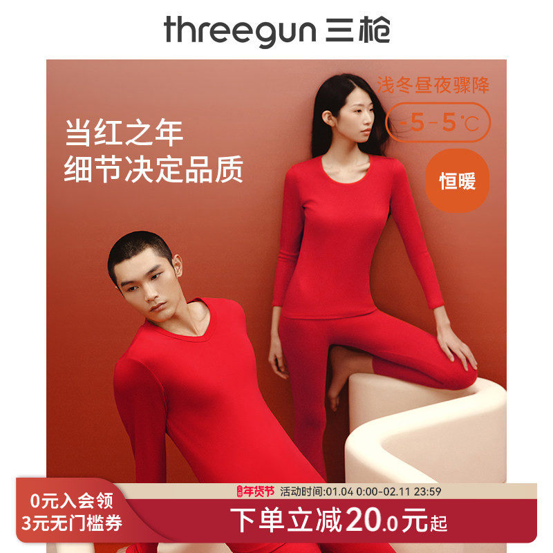 三枪保暖内衣套装女纯棉抗静电大红本命年马年秋衣秋裤男结婚新年