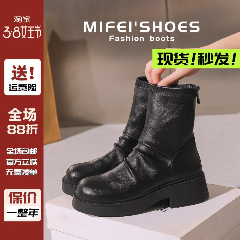 真皮!皱褶堆堆马丁靴女秋冬加绒厚底弹力瘦瘦短靴大码女靴41到43