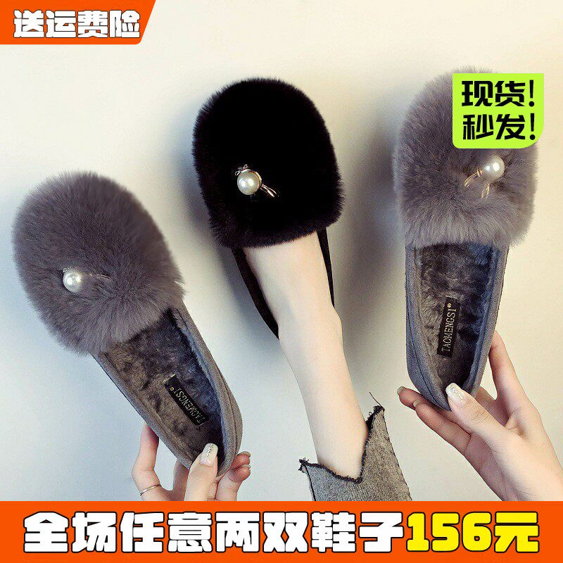 豆豆鞋女冬2025春秋毛毛鞋加绒厚底大码女鞋41到43外穿兔毛棉瓢鞋
