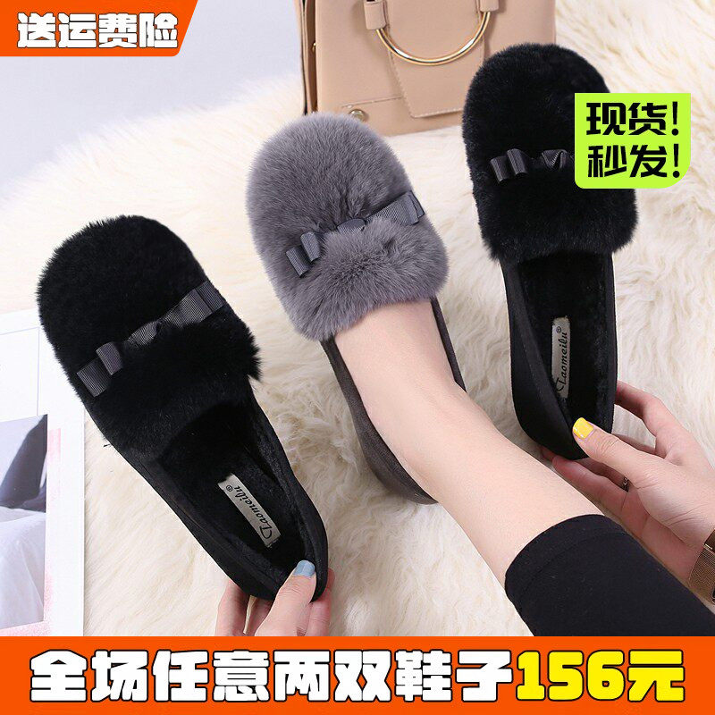 毛毛鞋女秋冬2025年新款厚底加绒豆豆鞋兔毛棉瓢鞋外穿大码41到43