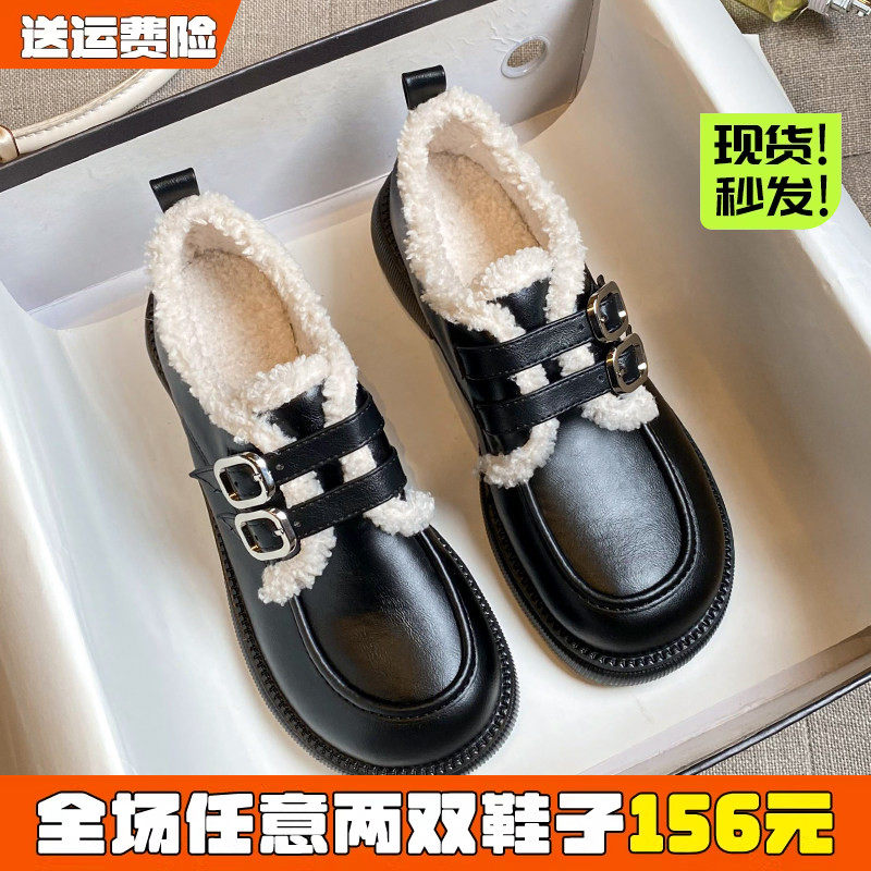 厚底英伦小皮鞋女秋冬2025新款毛毛乐福鞋加绒棉鞋大码女鞋41到43