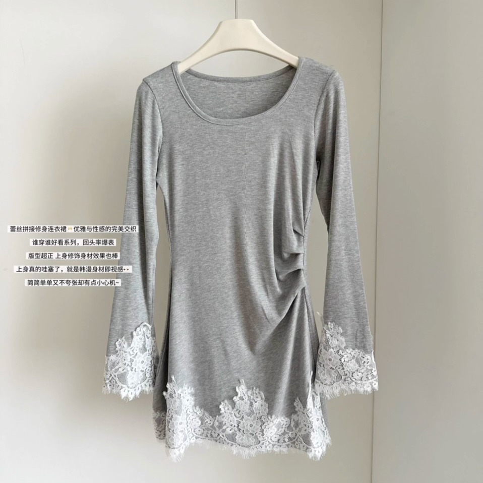 千金穿搭U领修身显瘦蕾丝下摆针织连衣裙巨好看的早秋打底短裙子