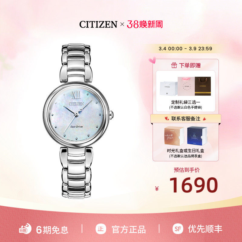 【38节礼物】西铁城官方旗舰店光动能手链贝母盘钢带女表EM0530
