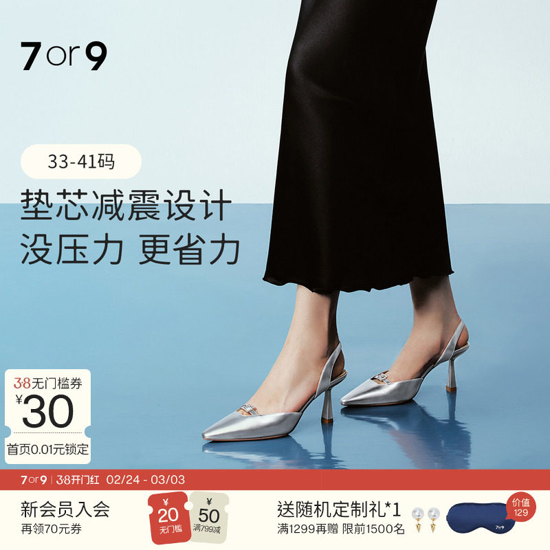 7or9冰花法式包头凉鞋2025气质舒适单鞋银色空气棉高跟鞋大码真皮