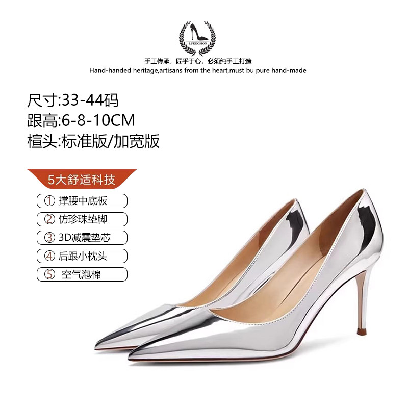 LUKE真皮镜面漆皮银色高跟鞋女浅口尖头细跟舒适性感绝美百搭单鞋