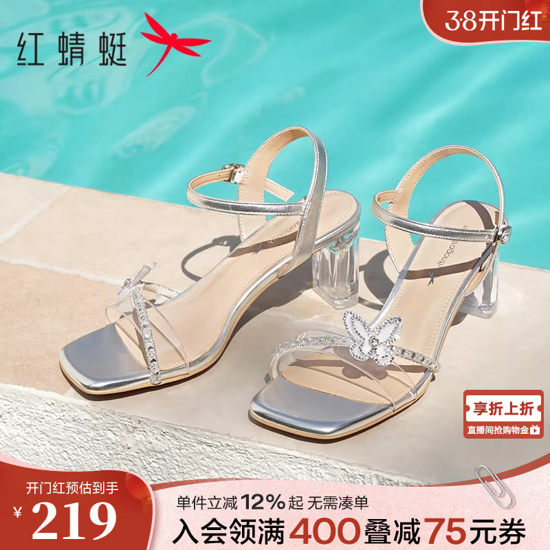 红蜻蜓高跟凉鞋女夏季新款真皮女鞋婚鞋仙女风鞋子银色水晶高跟鞋