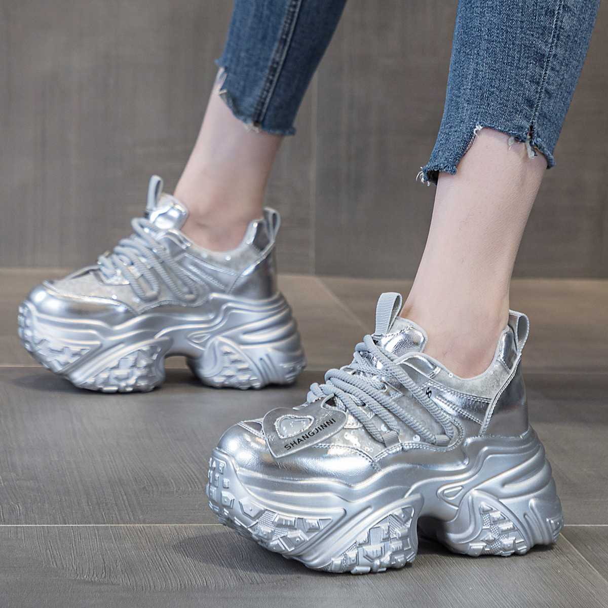 ZFCQ厚底单里银色内增高老爹鞋女真皮2026春新款超高跟10cm休闲鞋