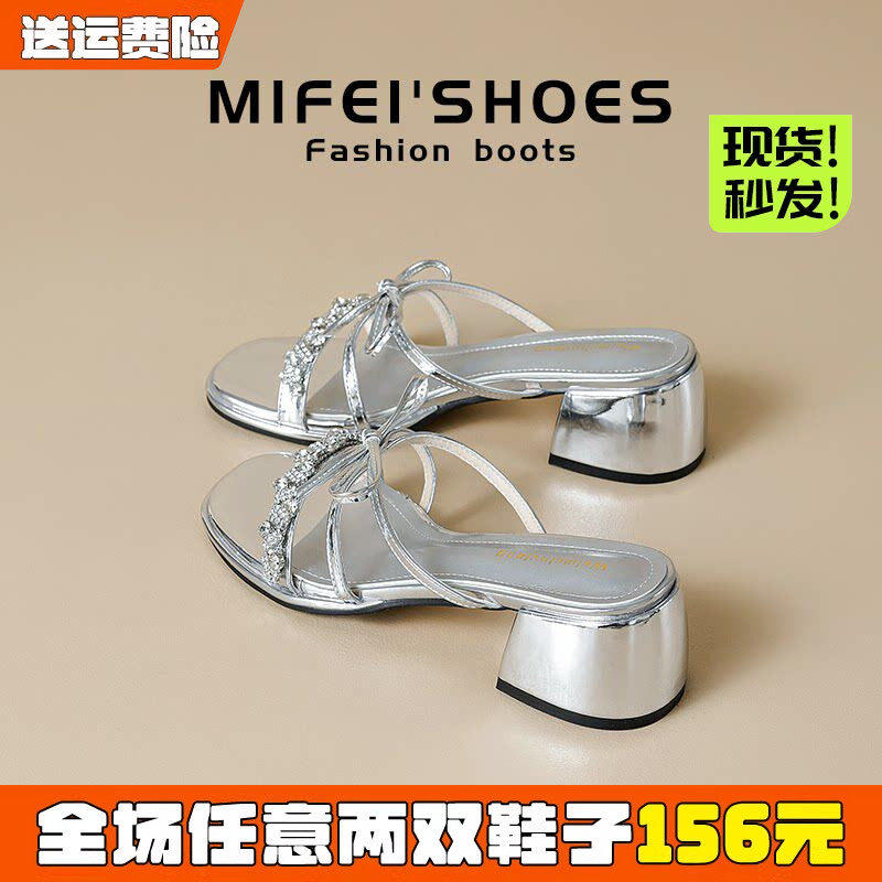 【米霏】真皮~银色凉鞋女夏季外穿法式绝美粗跟凉拖蝴蝶结高跟鞋