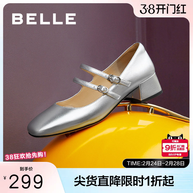百丽女鞋子新款真皮粗跟高跟鞋单鞋法式银色玛丽珍鞋B6T1DCQ4