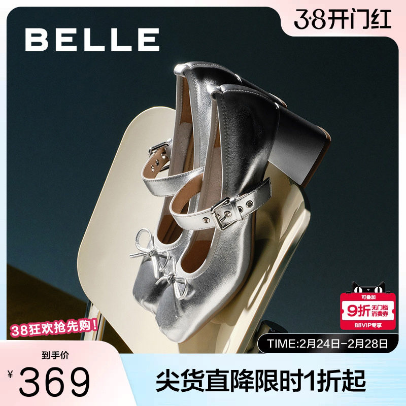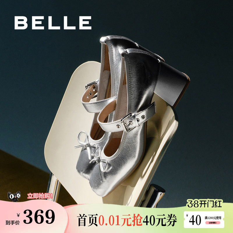 百丽女鞋子真皮高跟鞋法式浅口单鞋蝴蝶结银色玛丽珍鞋B5R1DCQ4