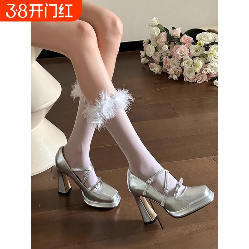 真皮~骄屿 银色玛丽珍单鞋女法式春秋新款气质百搭不累脚高跟鞋子
