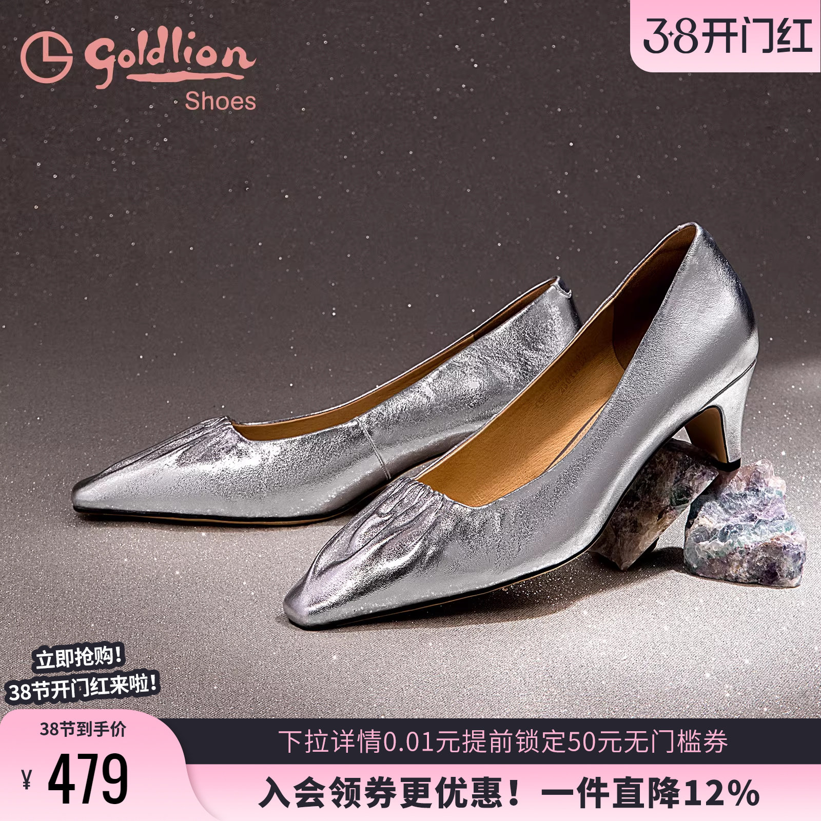 金利来银色单鞋女高级感春夏新款女鞋法式优雅真皮方头浅口高跟鞋