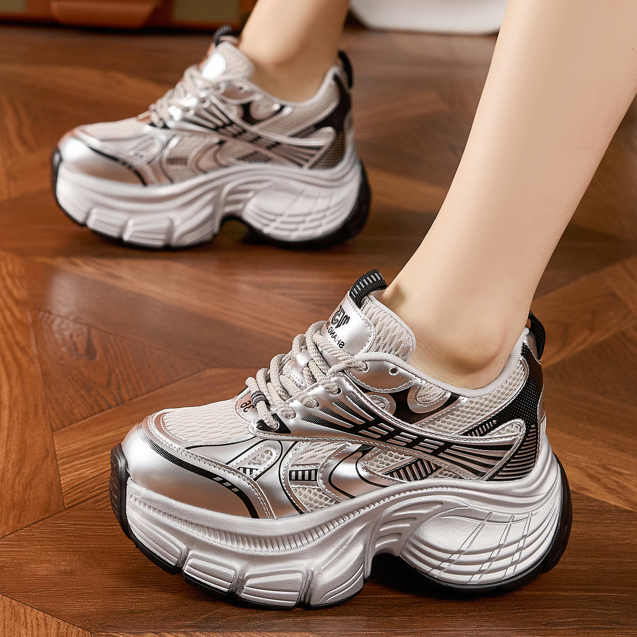 ZFCQ香港内增高老爹鞋女款银色2026春秋新款高跟显脚小真皮休闲鞋
