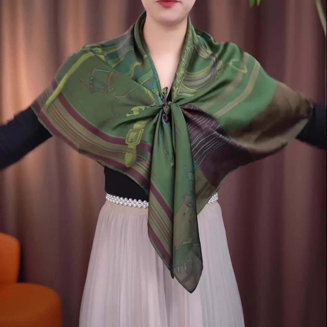 丝巾妈妈新款春秋洋气时尚高级感墨绿防晒披肩薄款围巾大方巾110